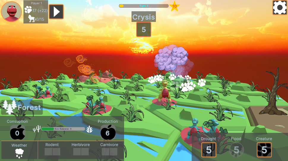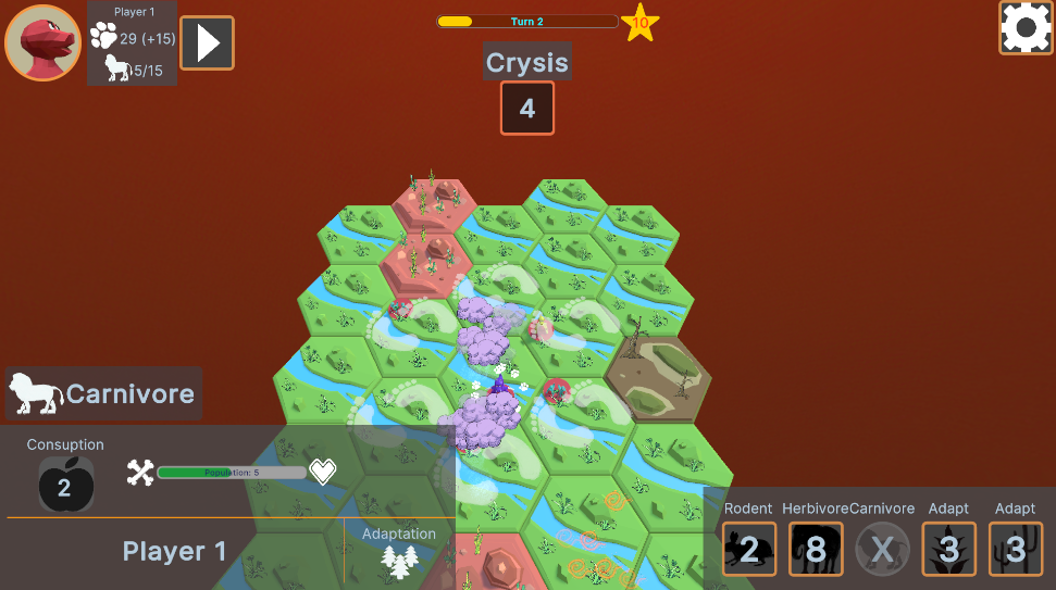 The player can summon a new creature on a tile, move it, and change its type. Rodents generate influence points for actions, large herbivores create a reliable food base for predators, and predators earn you victory points.
